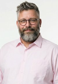 Mann mittleren Alters mit grauem Bart und Brille, der ein hellrosa Hemd mit Knöpfen trägt und vor einem schlichten Hintergrund lächelt.
