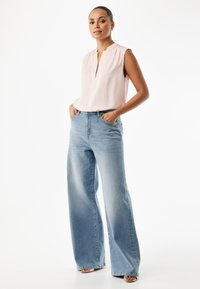 Ärmellose rosa Bluse mit einem v-förmigen Ausschnitt ohne Knöpfe und gerafften Details an den Schultern, kombiniert mit hellblauen, hoch taillierten Jeans.