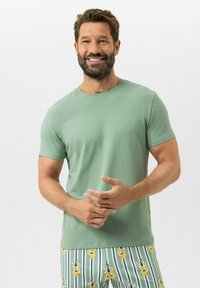Bärtiger Mann lächelt, trägt ein hellgrünes kurzärmeliges Hemd und gestreifte Pyjamahosen mit gelben Gummiente-Mustern, steht vor einem weißen Hintergrund.