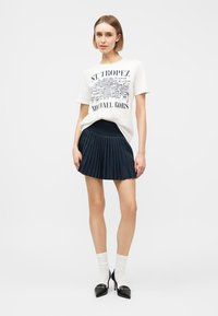 Frau trägt ein weißes St. Tropez Michael Kors T-Shirt mit maritimem Stadtbilddruck und einem schwarzen Faltenrock, stehend vor einem schlichten Hintergrund.