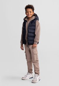 Junge in beigen Cargohosen, beigem Kapuzenpullover, schwarzer Steppweste und weißen Turnschuhen steht vor schlichter Hintergrund, blickt nach unten.