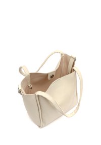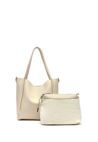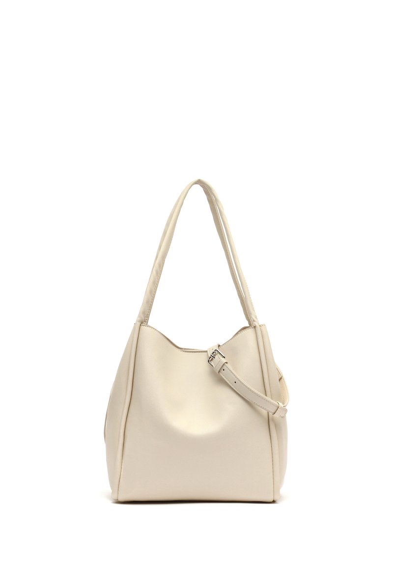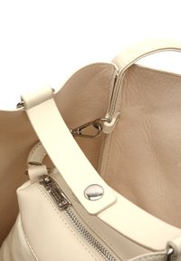 Schultertasche aus cremefarbenem Leder mit zwei langen Trägern und einem verstellbaren Schnallenriemen, dargestellt vor weißem Hintergrund.