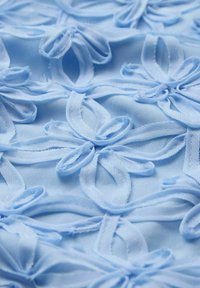 Helles blaues Spitzenkleid mit floraler Stickerei, langen Ärmeln und einem spielerischen Saum. Zusammen mit schwarzen Flip-Flops für einen Kontrast getragen.