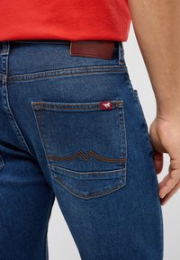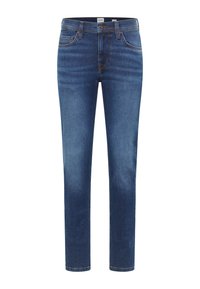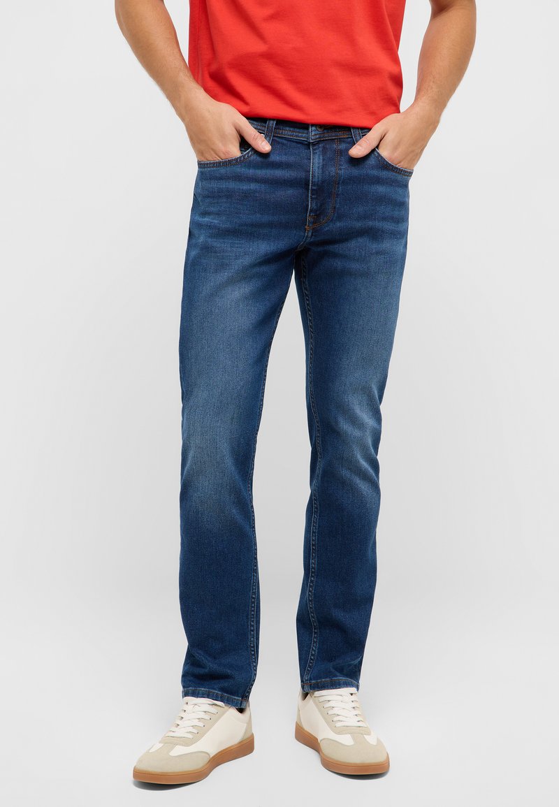 Mann in blauer Jeans und weißen Turnschuhen, der mit den Händen in den Taschen vor einem schlichten hellen Hintergrund steht.