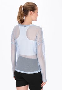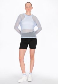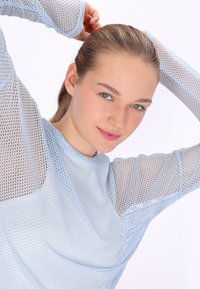 Junge Frau mit zurückgebundenen Haaren, die ein hellblaues, langärmliges Netzoberteil über einem weißen Tanktop und schwarzen Radhosen trägt.