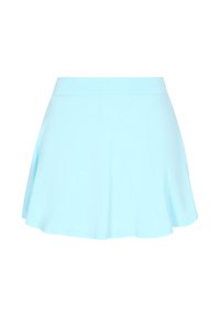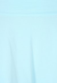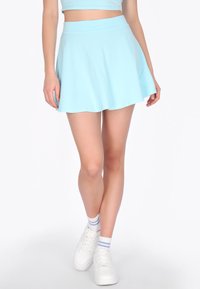 Frau trägt einen hellblauen ausgestellten Rock und ein kurzes Oberteil, dazu weiße Turnschuhe und weiße Socken mit zwei hellblauen Streifen.