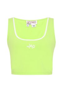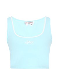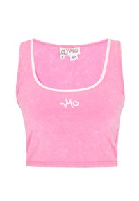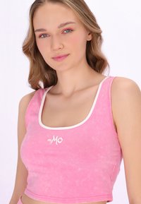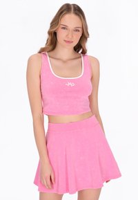 Junge Frau trägt ein pinkes kurzes Oberteil mit weißem Saum und passenden ausgestellten Rock, posiert vor weißem Hintergrund.