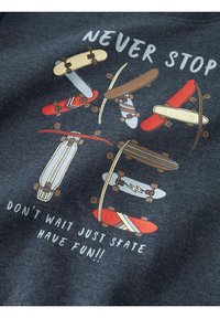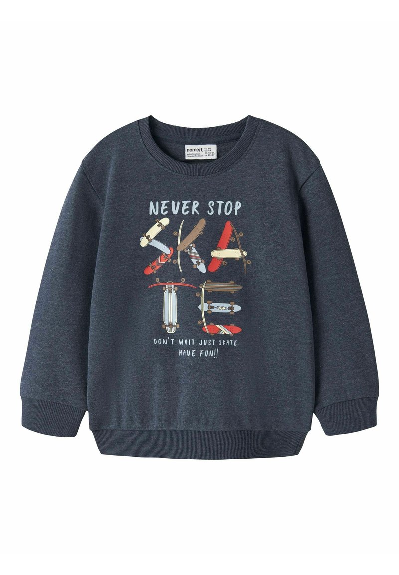 Dunkelgrauer Kindersweatshirt mit Skateboards, die Buchstaben bilden, Text lautet „Never Stop Skate. Don't Wait Just Skate Have Fun!“