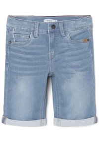 Weißes T-Shirt mit dem Text "Studio Edition", hellblaue Denim-Shorts mit Umschlägen, weiße Sneakers und schwarz-weiße gestreifte Socken.