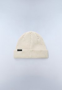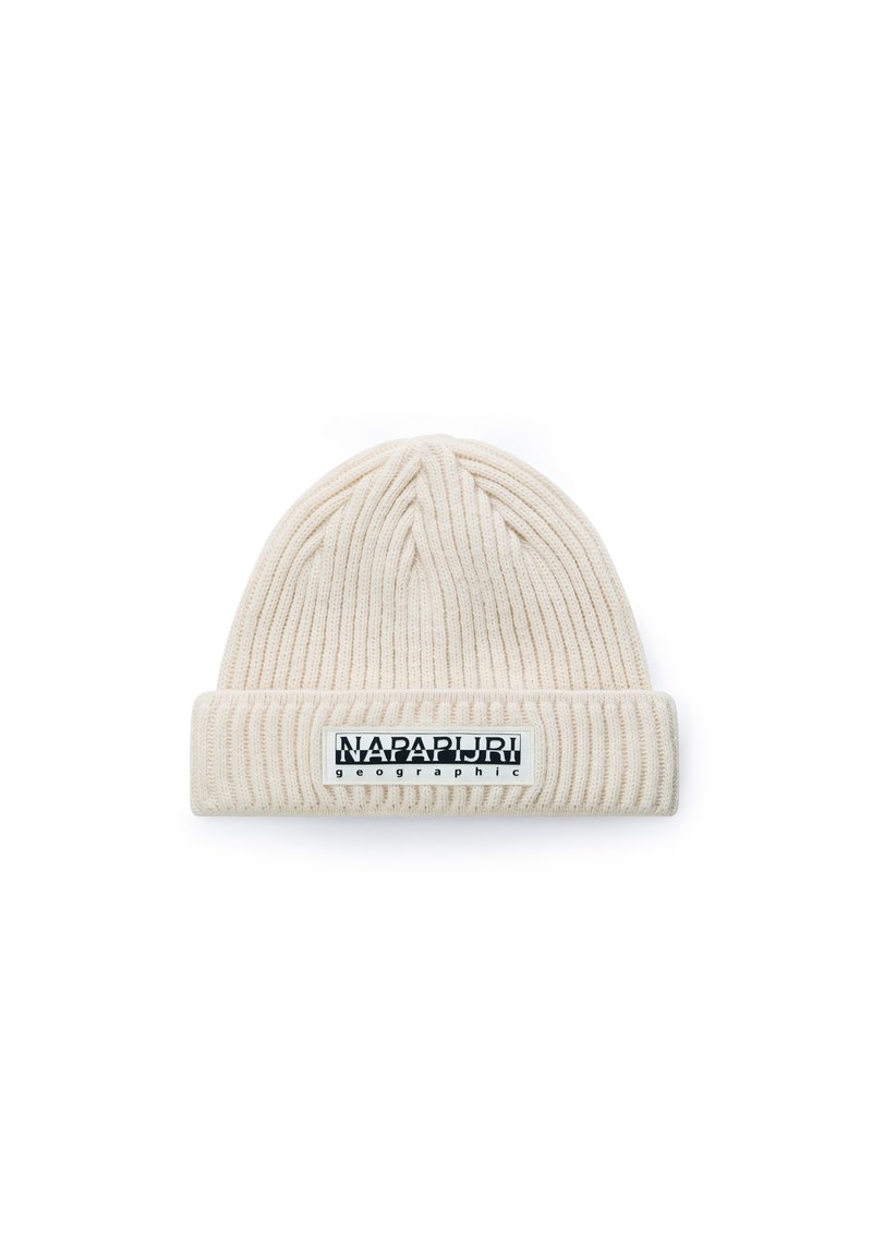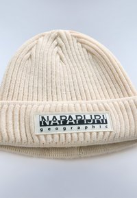 Cremefarbene gerippte Strickmütze mit umgeschlagenem Bündchen und rechteckigem Napapijri Geographic Logoaufnäher vorne mittig.