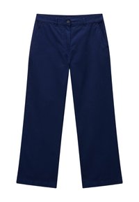Marineblaue, gerade geschnittene Hosen mit Knopf- und Reißverschluss, Seitentaschen und Gürtelschlaufen, flach auf einem weißen Hintergrund liegend.