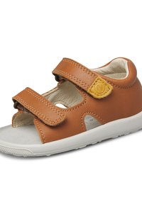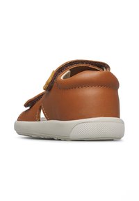 Brauner Ledersandale für Kleinkinder mit zwei verstellbaren Klettverschlüssen und weißer Gummisohle.