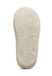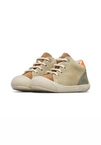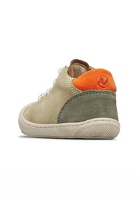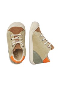 Kinderschuh aus Wildleder mit beigen, braunen, grünen und orangen Einsätzen, weißen Schnürsenkeln und strukturierter Gummisohle, von der Seite gesehen.