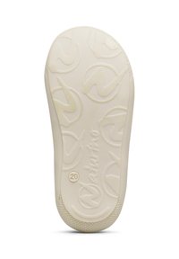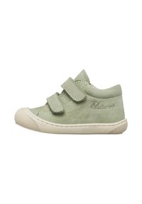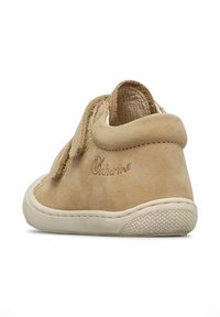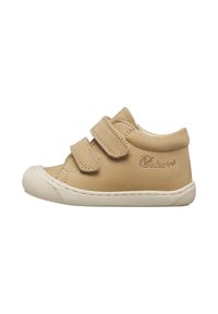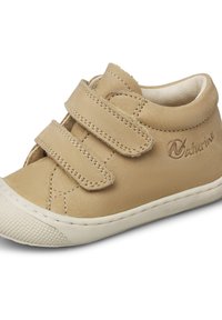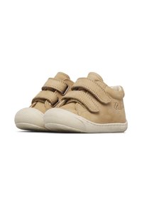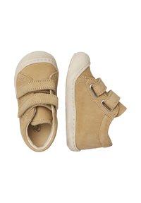 Beiger Kleinkind-Sneaker mit zwei verstellbaren Klettverschlüssen, Gummisohle, verstärkter Zehenpartie und aufgenähtem Markenlogo an der Seite.