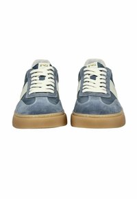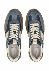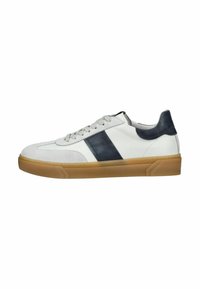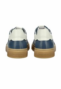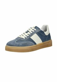 Blauer und weißer Sneaker aus Leder mit niedrigem Schaft, Gummisohle in Karamellfarbe und weißen Schnürsenkeln, von der Außenseite betrachtet.