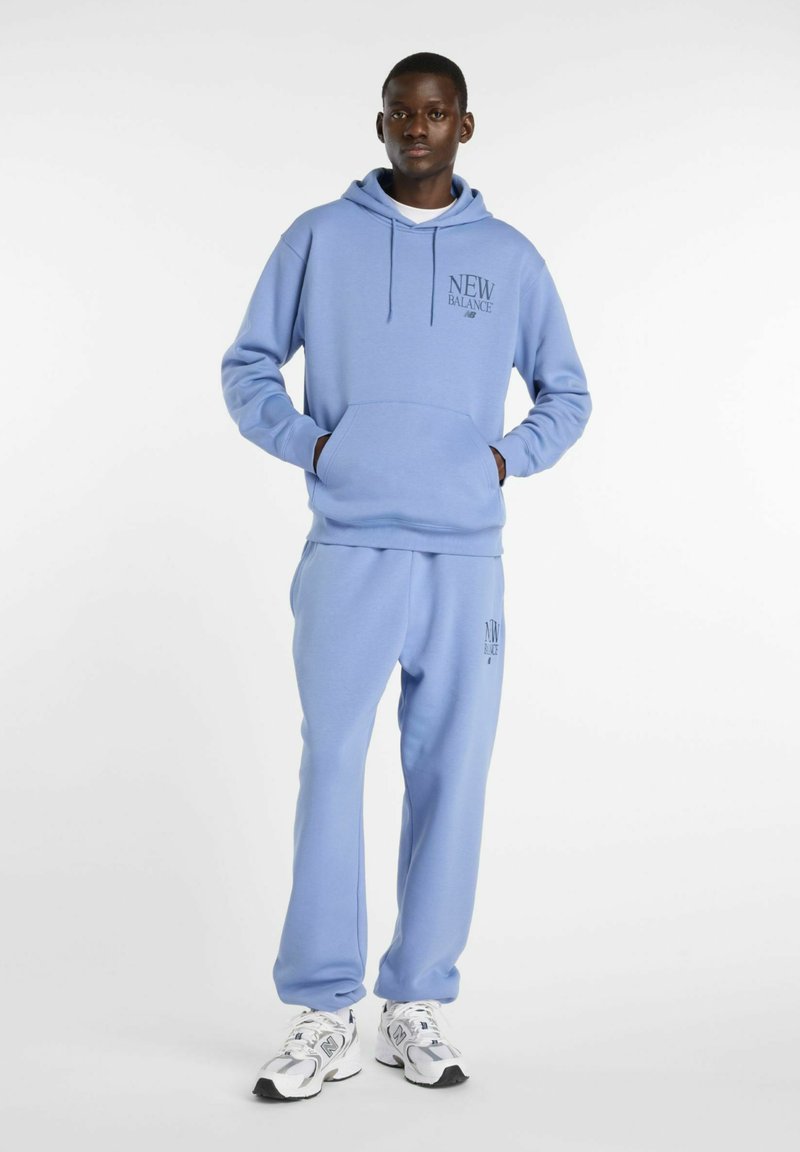 Mann steht, trägt eine hellblaue New Balance Kapuzenjacke und passende Jogginghose mit weißen New Balance Sneakern, Hände in den Taschen, neutraler Hintergrund.