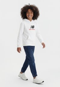 Lächelndes Kind läuft, trägt einen weißen New Balance Hoodie, blaue Jeans und weiße New Balance Sneakers auf weißem Hintergrund.