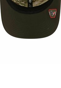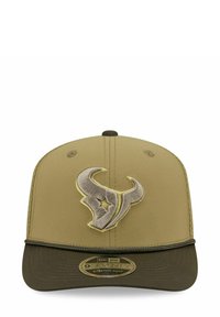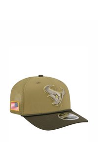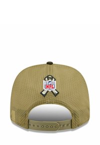 Khakifarbene Baseballmütze mit olivgrünem Schirm und Netzrücken. Verfügt über ein gesticktes Logo in Grau, mit kontrastierender Naht und flachem Schirmdesign.