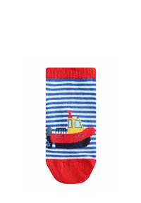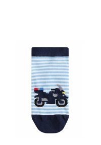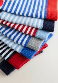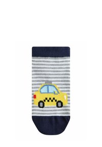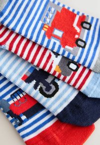 Sieben Paare gestreifter Kindersocken, jeweils mit einem anderen Design von Einsatz- oder Transportfahrzeugen, diagonal auf weißem Hintergrund angeordnet.