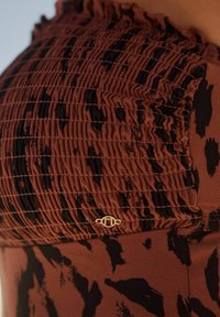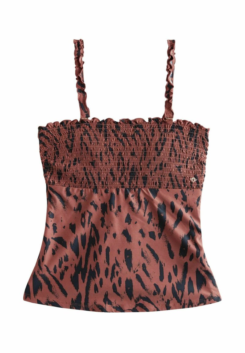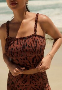 Braunes Smocktop mit schwarzem Leopardenmuster, das dünne, Rüschenträger und einen ausgestellten Saum hat. Weicher, dehnbarem Stoff.