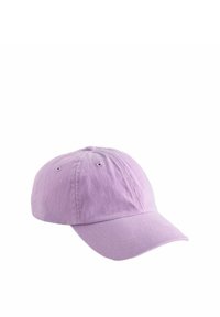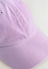Lila Baumwoll-Baseballkappe mit gebogenem Schirm, verstellbarem Riemen und sechs Belüftungslöchern für Atmungsaktivität. Glatte Textur.