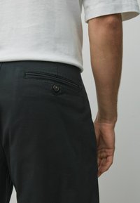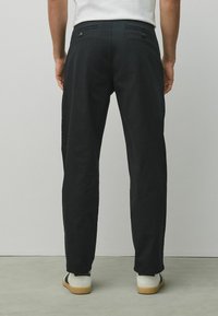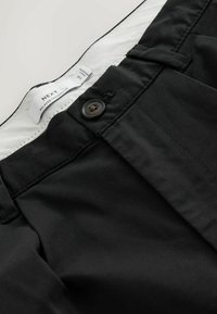 Mann trägt schwarze plissierte Hose, weißes T-Shirt und weiße Sneakers mit schwarzen Streifen, steht vor einem hellgrauen Hintergrund.