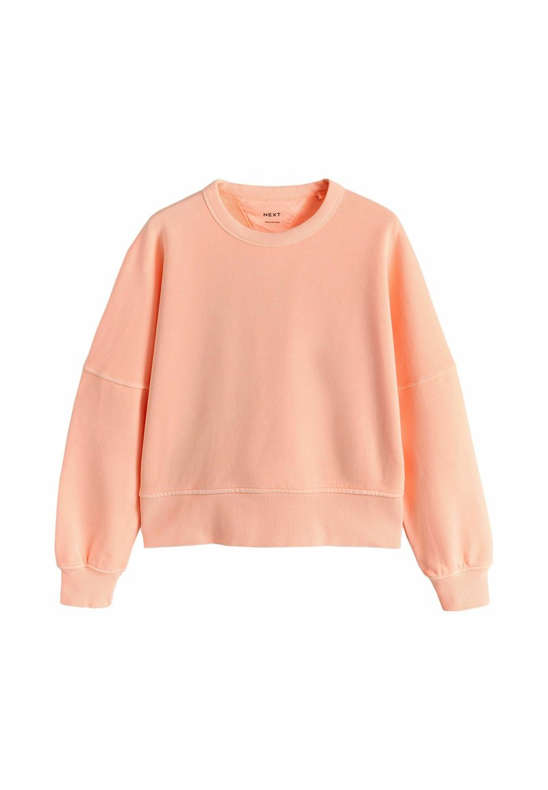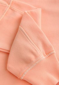 Weiches, pfirsichfarbenes Sweatshirt mit Rundhalsausschnitt, langen Ärmeln sowie gerippten Bündchen und Saum, flach auf einem weißen Hintergrund liegend.