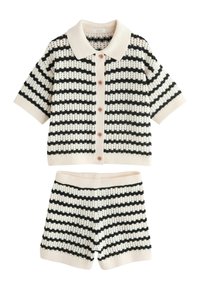 Zweiteiliges Strickset mit kurzärmeligem, knöpfbarem Oberteil und passenden Shorts in einem gestreiften Muster aus Orange, Pink und Creme.