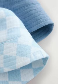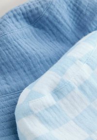 Zwei Bucket-Hüte: einer in einfarbigem Hellblau, der andere hellblau mit karierter Musterung. Beide haben breite Krempen und eine strukturierte Stoffoberfläche.