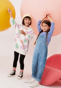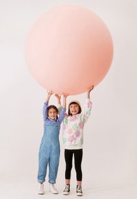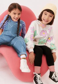 Zwei lächelnde Mädchen sitzen auf einem rosa geschwungenen Stuhl, eines trägt blaue Latzhosen und ein gestreiftes Shirt, das andere ein Sweatshirt mit Blumenmuster, schwarze Leggings und eine gelbe Mütze.