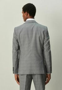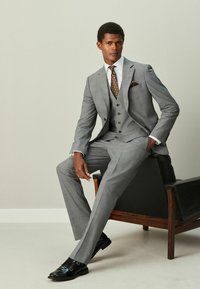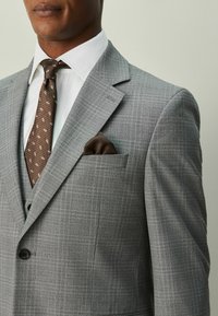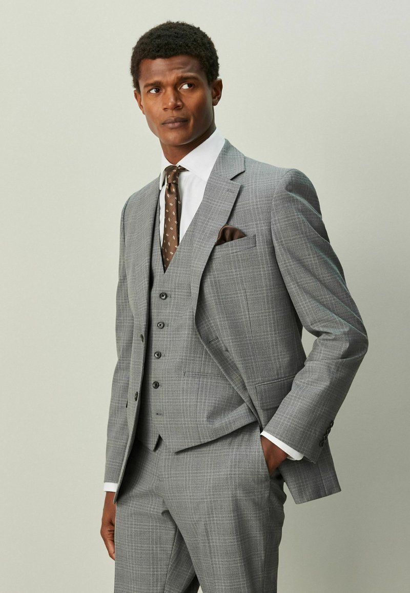 Grauer dreiteiliger Anzug mit dezentem Karomuster, ausgestattet mit einem Revers mit Kerbe, einer Weste mit vier Knöpfen und einer braunen Krawatte mit Punkten. Ein Einstecktuch ist enthalten.