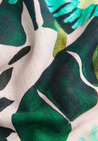 Trägerloser Jumpsuit mit gerafftem Oberteil und weitem Bein, mit einem bunten tropischen Blatt- und Vogeldruck.