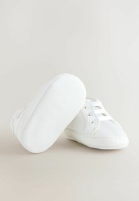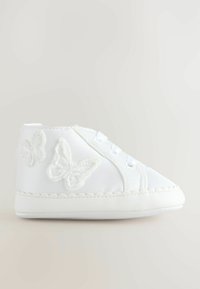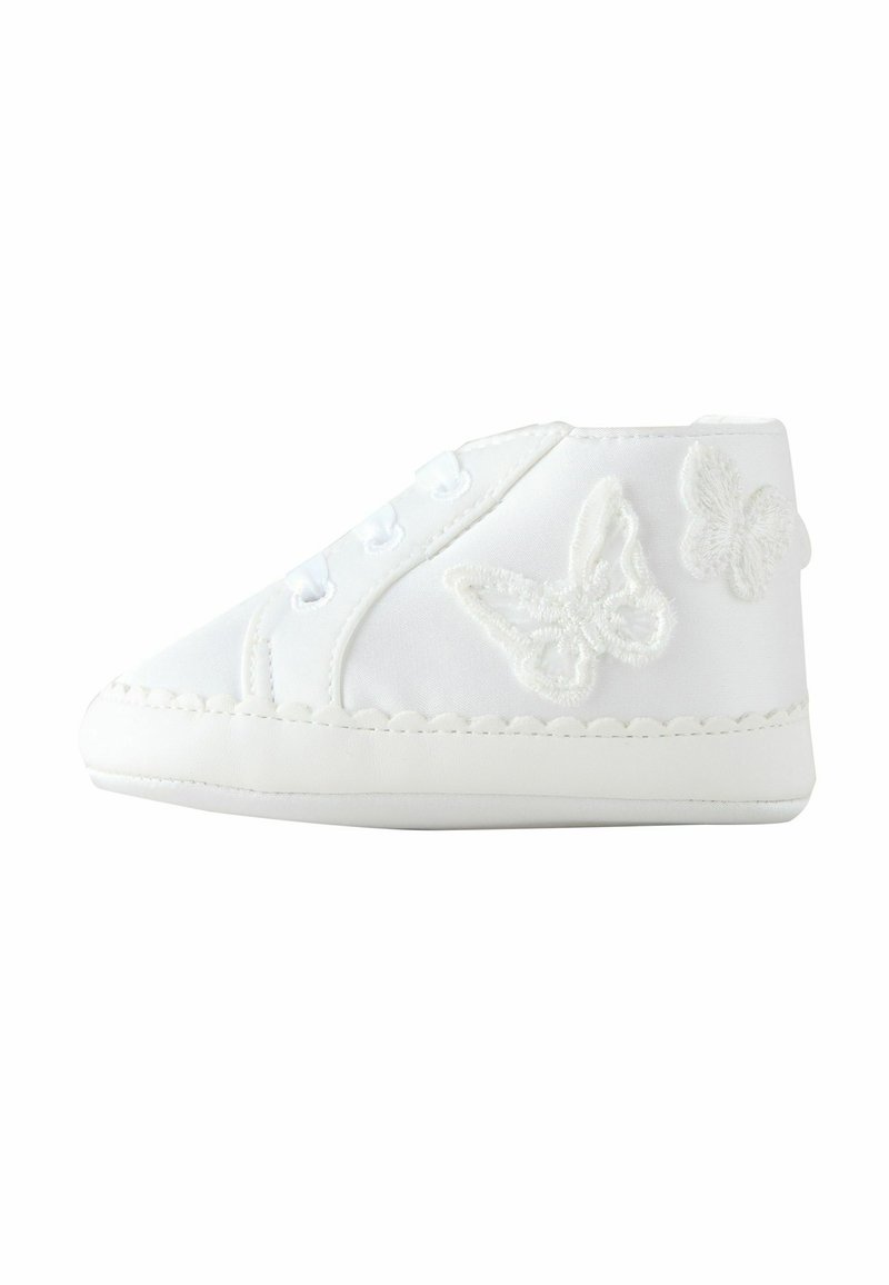 Weißer Babyschuh mit weicher Sohle und bestickten Schmetterlingsmotiven an der Seite, dargestellt vor einem schlichten weißen Hintergrund.