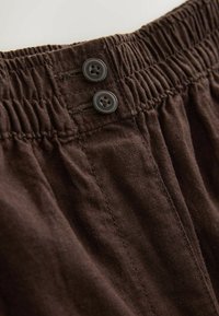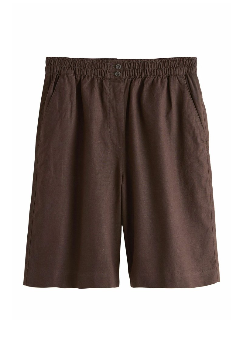 Braune Baumwollshorts mit elastischem Bund, zwei Knöpfen vorne und Seitentaschen, dargestellt vor weißem Hintergrund.