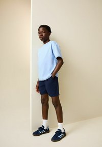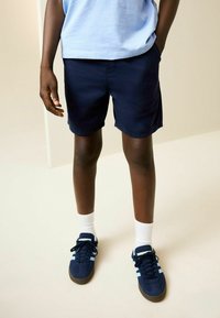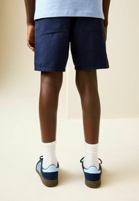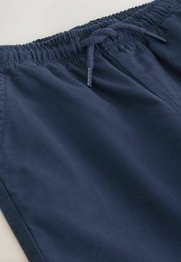 Marineblaue Shorts aus leichtem Stoff, mit elastischem Bund und Kordelzug, zwei Seitentaschen und einer glatten Textur.