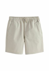 Kind trägt marineblaue Shorts, weiße Sneakers, weiße Socken und ein hell gestreiftes Hemd, die Hände in den Taschen, steht drinnen.