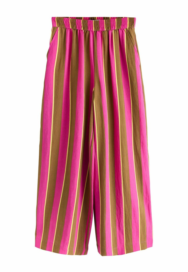Weite Hosen mit vertikalen Streifen in Rosa, Braun und Gelb, mit elastischem Bund und Seitentaschen.