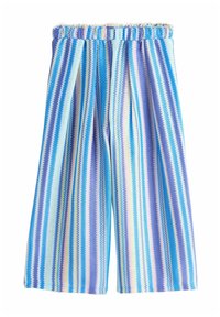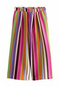 Weit geschnittene Strickhosen mit vertikalen Streifen in Grün, Pink, Orange, Lila, Blau und Creme, ausgestattet mit einem gerafften elastischen Bund.