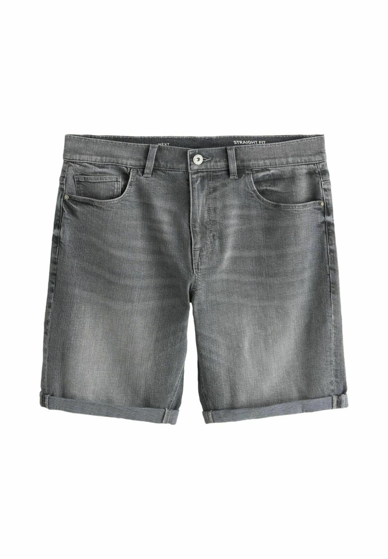 Graue Denim-Shorts in gerader Passform mit vorderen und Münztaschen, umgeschlagenen Säumen und Knopfverschluss.