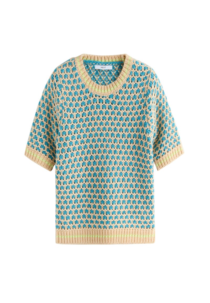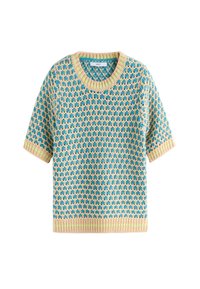 Kurzhängiger Pullover mit einem blauen und cremefarbenen Muster sowie grünen Akzenten, runder Halslinie und strukturiertem Strickstoff.