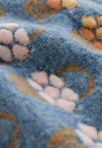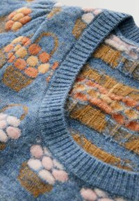 Gestrickter blauer Pullover mit einem Blumenkorb-Muster in Orange, Rosa und Weiß. Kurze Puffärmel und ein weiter Ausschnitt.