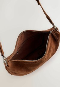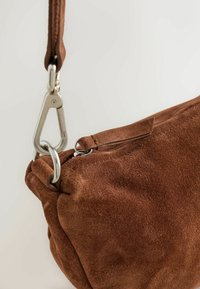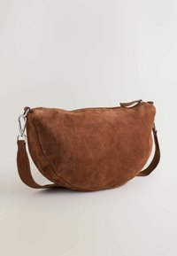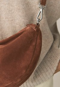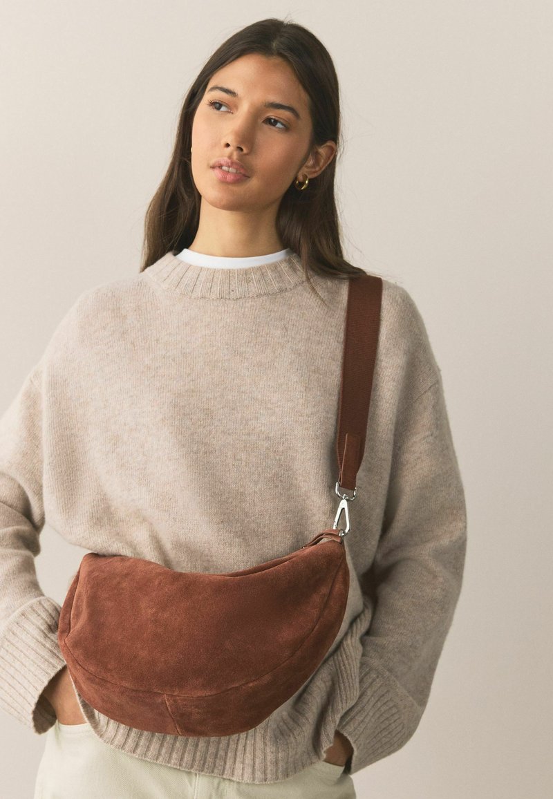 Braune Schultertasche aus Wildleder mit abgerundeter Form, ausgestattet mit einem Stoffriemen und silberner Hardware, getragen über einem hellbeigen Pullover.