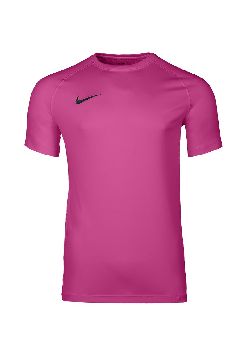Helles pinkes Sportshirt mit kurzen Ärmeln, Rundhalsausschnitt und kleinem schwarzem Nike-Logo auf der oberen linken Brust.