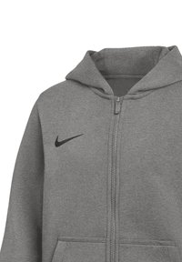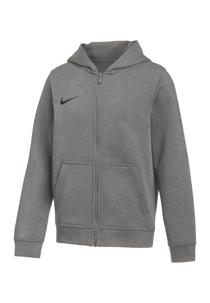 Grau melierter Kapuzenpullover mit durchgehendem Reißverschluss, Fronttaschen und schwarzem Nike-Swoosh-Logo auf der linken Brust, mit langen Ärmeln und Kapuze.