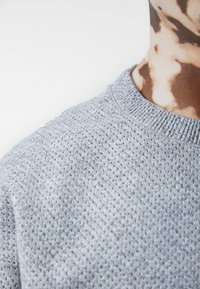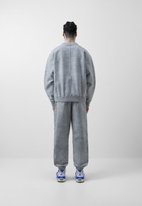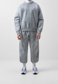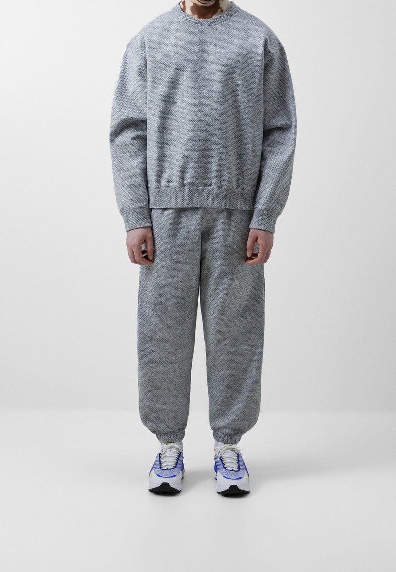 Mann trägt lässiges graues Sweatshirt mit Struktur und passende Jogginghose, dazu weiße und blaue Sneaker, steht vor einfachem weißen Hintergrund.