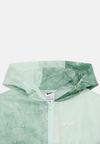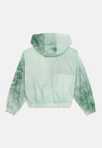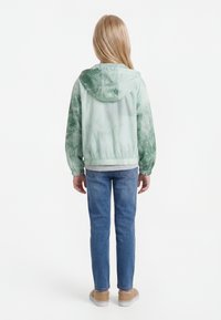 Mädchen mit langen blonden Haaren, das geht, trägt einen grünen Zip-Hoodie mit Batikmuster, ein graues Shirt, blaue Jeans und beige Schlupfschuhe vor weißem Hintergrund.