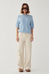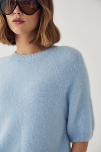 Frau mit übergroßen schwarzen Sonnenbrillen, hellblauem, flauschigem Kurzarm-Pullover und beigen, hoch taillierten Hosen vor einfarbigem Hintergrund.