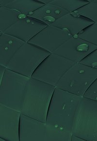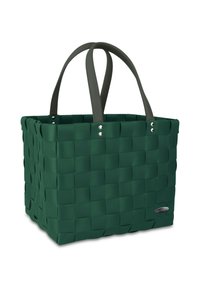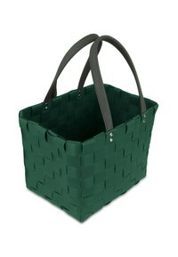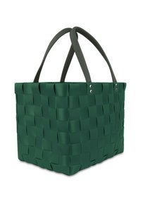 Grüne geflochtene Tragetasche aus gummiähnlichem Material mit zwei grauen Griffen und silbernen Hardware-Akzenten. Verfügt über ein strukturiertes Muster.