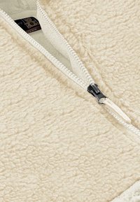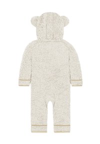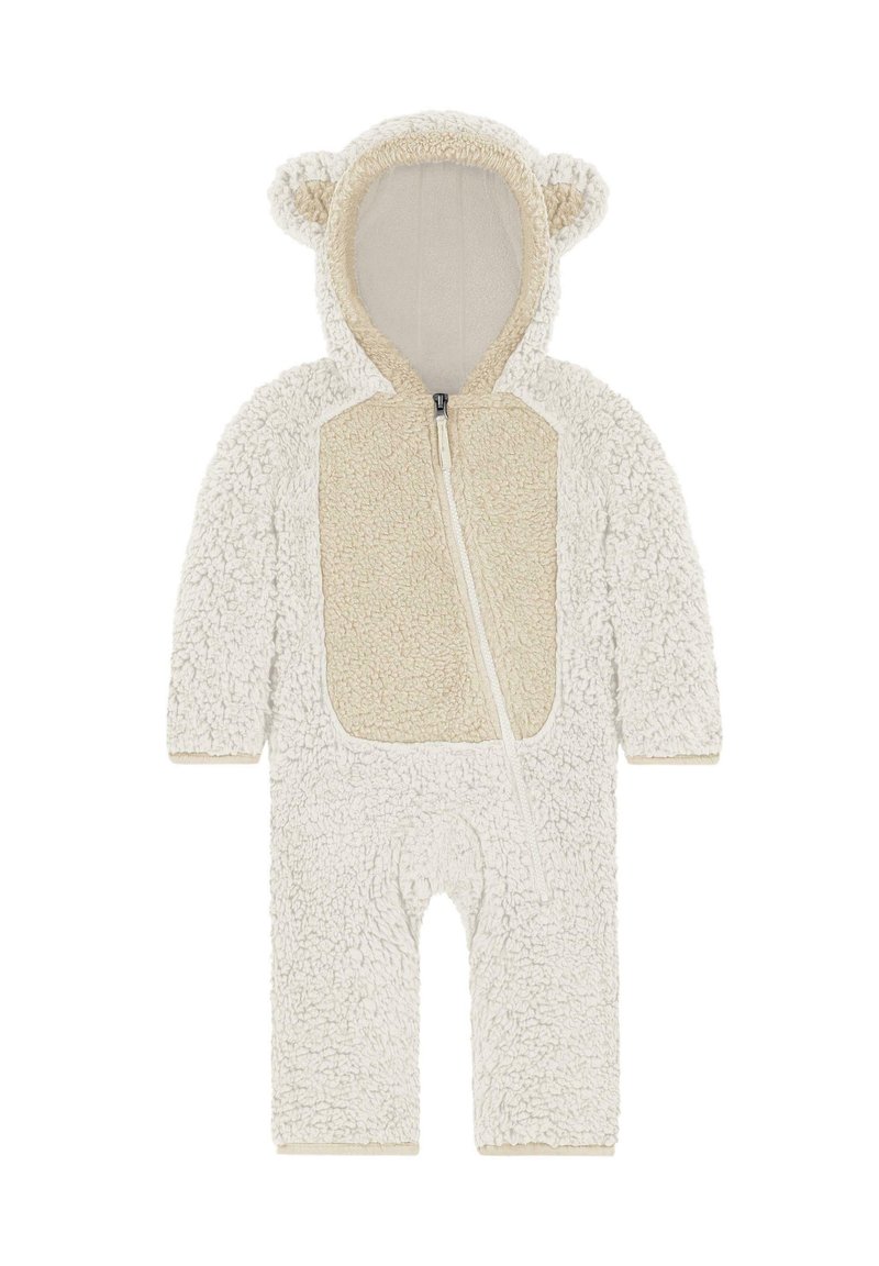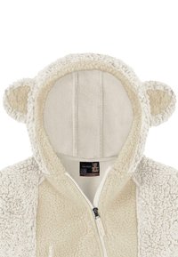 Cremefarbener Fleece-Overall mit strukturierten Oberflächen, Reißverschluss und einer Kapuze mit kleinen Ohren. Weiches beiges Brustpanel inklusive.