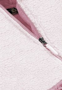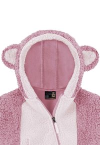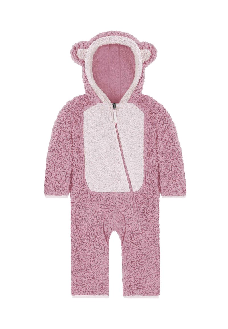 Rosa flauschiger Einteiler mit Kapuze, der mit Bärenohren verziert ist, Reißverschluss und einem weißen Fellfrontpaneel. Weicher Stoff über die gesamte Kleidung.